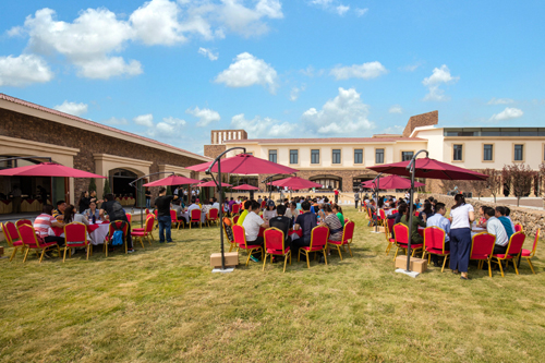 豐收節(jié)當天,與會嘉賓首先參觀了葡萄園。九頂莊園葡萄園現(xiàn)有種植面積90公頃,分片植有赤霞珠、霞多麗、味而多、梅鹿輒、品麗珠、蛇龍珠、西拉等多種葡萄。所有葡萄藤均由法國進口,以確保獲得最為優(yōu)質(zhì)的克隆種與單一種。九頂莊園同時建有兩個溫室苗圃,用以培育嫁接植株,擴大葡萄園。