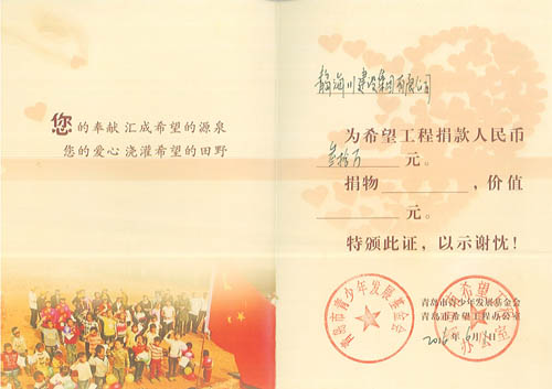 海川集團(tuán)多年來一直把履行社會(huì)義務(wù),回饋社會(huì),報(bào)效祖國(guó)作為企業(yè)的重要職責(zé),在企業(yè)發(fā)展的同時(shí),不忘社會(huì)公益事業(yè),十幾年來已向社會(huì)公益事業(yè)捐款累計(jì)超過460萬(wàn)元:先后向青島市教師素質(zhì)專項(xiàng)基金捐款30萬(wàn)元,捐建貴州江口縣雙江鎮(zhèn)希望中學(xué)30萬(wàn)元,捐建膠南市黃山鎮(zhèn)希望小學(xué)30萬(wàn)元。并通過基金會(huì)捐助惜福鎮(zhèn)后金小學(xué)多臺(tái)電腦用于教學(xué),2013年4月,又向惜福鎮(zhèn)“為了惜福孩子的明天”大型公益活動(dòng)捐款30萬(wàn)元。另外,在汶川地震期間,組織廣大職工開展賑災(zāi)捐助活動(dòng),奉獻(xiàn)愛心,先后向市紅十字會(huì)捐款129690元,榮獲“紅十字博愛銀獎(jiǎng)”。近年又為惜福鎮(zhèn)教育基金捐款300萬(wàn)元。2014年至今,連續(xù)三次組織員工積極開展無償獻(xiàn)血公益活動(dòng),緩解了島城醫(yī)療機(jī)構(gòu)臨床用血的緊張局面,充分體現(xiàn)了海川集團(tuán)及廣大員工的社會(huì)責(zé)任感和無私奉獻(xiàn)精神。